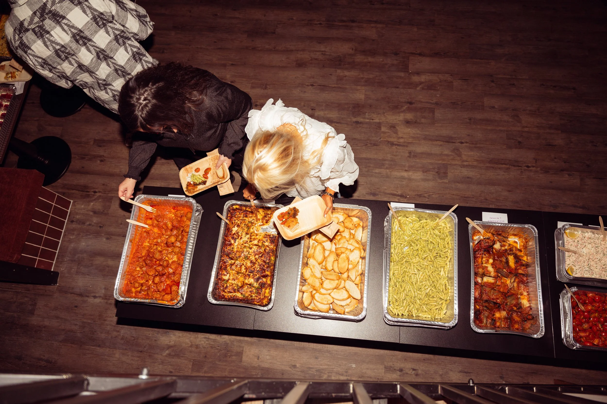Vi kan tilby mat til grupper på over 20 personer fra vår søsterrestaurant Casa Pisano. Vi tillater også medbragt mat, så dersom du skulle bli sulten har vi flust av gode naboer som tilbyr take away - eller du kan bestille fra mobilen og få det levert på “døra”.